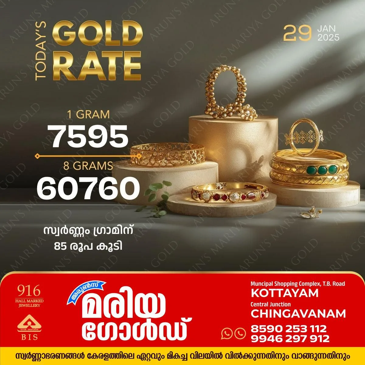 അറിയാം കോട്ടയം അരുൺസ് മരിയാ ഗോൾഡിലെ സ്വർണ വില , ഒരു പവൻ സ്വർണത്തിന്റെ ഇന്നത്തെ വിപണി വില 60,760 രൂപയാണ്. സ്വർണം ഗ്രാമിന് 85 രൂപയാണ് വർധിച്ചത്.
