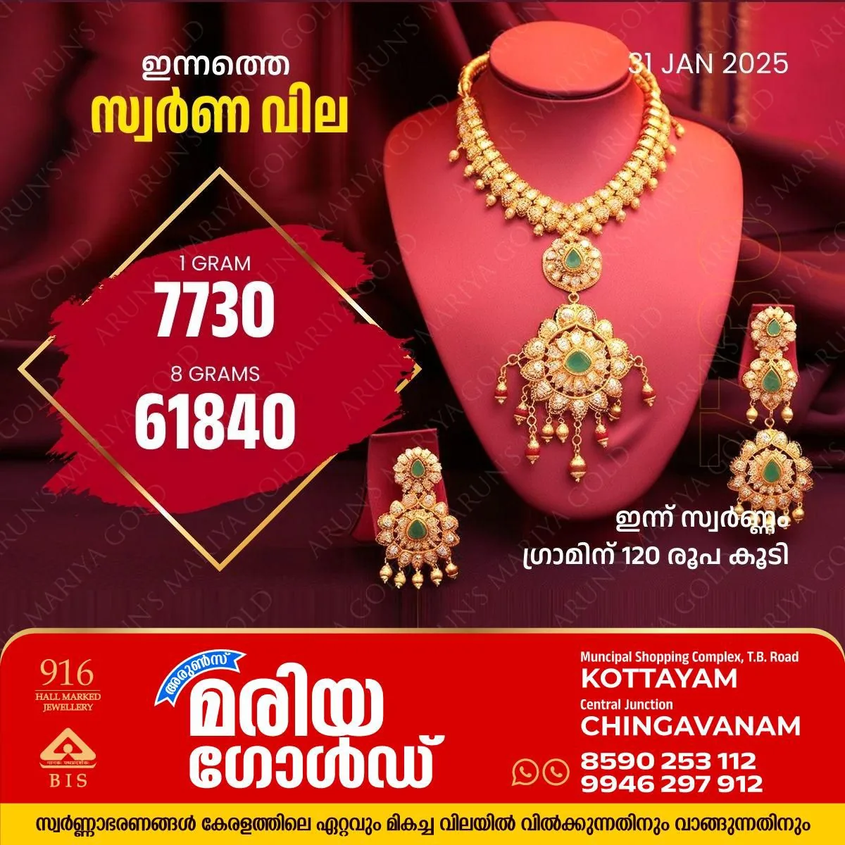 കൊച്ചി : സ്വർണ വിലയില് വൻവർധനവ്. അറിയാം കോട്ടയം അരുൺസ് മരിയാ ഗോൾഡിലെ സ്വർണ വില , പവന് 960 രൂപ കൂടി 61840 രൂപയായി. ഗ്രാമിന് 120 രൂപയാണ് കൂടിയത്. ഒരു ഗ്രാം സ്വര്ണത്തിന് 7730 രൂപയാണ് ഇന്നത്തെ വില.