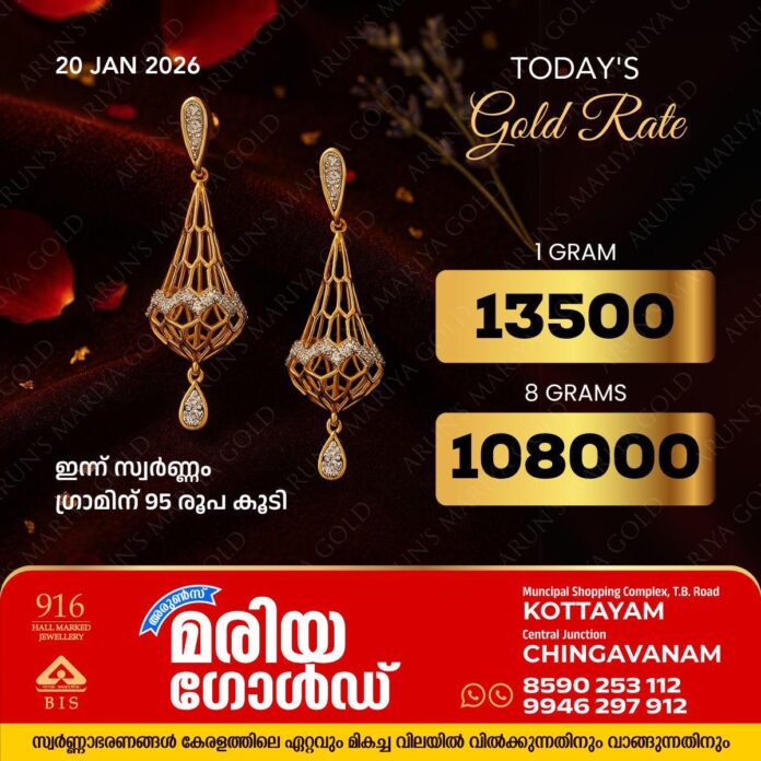 റെക്കോര്ഡുകള് ഭേദിച്ച് സ്വർണ കുതിപ്പ് ; അറിയാം അരുൺസ് മരിയാ ഗോൾഡിലെ ഇന്നത്തെ (20/01/26) സ്വർണ വില January 20, 2026 WhatsAppFacebookTwitterLinkedin Spread the loveകോട്ടയം : റെക്കോര്ഡുകള് ഭേദിച്ച് സ്വർണ കുതിപ്പ്. അറിയാം അരുൺസ് മരിയാ ഗോൾഡിലെ ഇന്നത്തെ (20/01/26) സ്വർണ വില. Please enable JavaScriptplay-sharp-fill LinkEmbedCopy and paste this HTML code into your webpage to embed. 22 കാരറ്റ് സ്വര്ണത്തിന് ഗ്രാമിന് 95 രൂപ കൂടി 13500 രൂപയും പവന് 760 രൂപ കൂടി 108000 രൂപയിലുമാണ് വ്യാപാരം നടക്കുന്നത്.