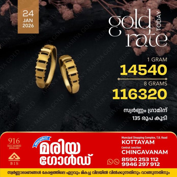 കോട്ടയം : സംസ്ഥാനത്ത് സ്വർണവില വീണ്ടും ഉയർന്നു. അറിയാം കോട്ടയം അരുൺസ് മരിയാ ഗോൾഡിലെ ഇന്നത്തെ സ്വർണ വില.