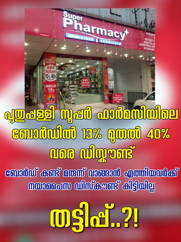 എന്നാൽ, ഈ രണ്ട് ഫാർമസികളുടെയും മാതൃകയിൽ ബോർഡ് സ്ഥാപിച്ചാണ് പുതുപ്പള്ളിയിലെ സൂപ്പർ ഫാർമസി മെഡിക്കൽ സ്റ്റോർ തട്ടിപ്പ് നടത്തുന്നത്. സാധാരണക്കാരായ രോഗികളാണ് ഇവിടെ മരുന്ന് വാങ്ങാൻ എത്തുന്നത്. ഒരു രൂപയെങ്കിലും മരുന്നു വിലയിൽ ലാഭം പ്രതീക്ഷിച്ചാണ് ഇവർ ഡിസ്ക്കൗണ്ട് എന്ന ബോർഡ് കാണുന്ന മെഡിക്കൽ സ്റ്റോറുകളിൽ കയറിയിറങ്ങുന്നത്.