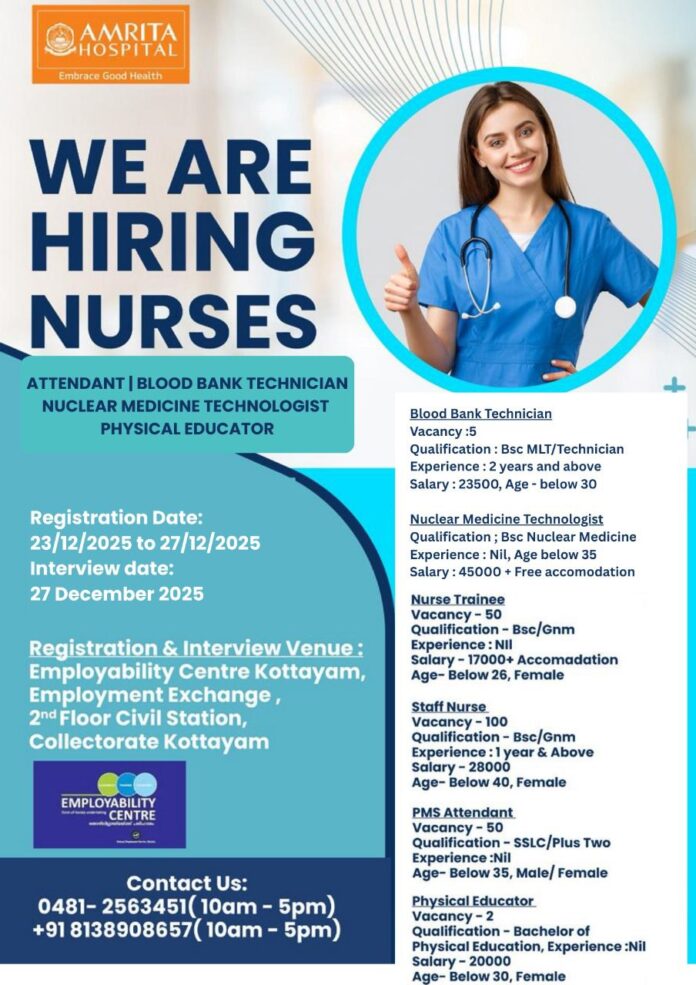 ഇതുവരെ ജോലിയൊന്നും ആയില്ലേ? എങ്കിൽ ഡിസംബർ 27 ന് നടക്കുന്ന ഇന്റർവ്യൂവിൽ പങ്കെടുക്കാൻ ഇപ്പോൾ തന്നെ രജിസ്റ്റർ ചെയ്തോളൂ… ; അമൃത ഹോസ്പിറ്റലിൽ 200-ലേറെ ഒഴിവുകൾ ; കൂടുതൽ വിവരങ്ങൾക്ക് 0481-2563451, 8138908657 നമ്പറുകളിൽ ഈ ബന്ധപ്പെടുക
