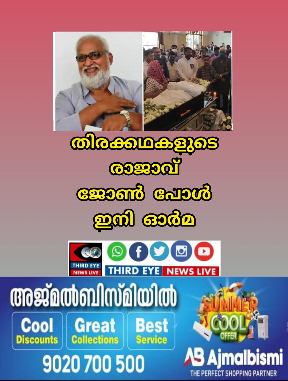 ഏറെ ആഗ്രഹിച്ച പലതും പൂർത്തിയാക്കാനാവാതെയാണ് ജോൺ പോൾ വിടവാങ്ങിയത്. സംസ്ഥാന സർക്കാരിന് വേണ്ടി മന്ത്രി പി രാജീവും എറണാകുളം ജില്ല കളക്ടർ ജാഫർ മാലിക്കും ചേർന്ന് ജോൺ പോളിന് അന്തിമ ഉപചാരം അർപ്പിച്ചു. പ്രതിപക്ഷ നേതാവ് വി ഡി സതീശനും, സിനിമ മന്ത്രി സജി ചെറിയാനും അന്ത്യാഞ്ജലി അർപ്പിക്കാനായി എത്തി. താരങ്ങളെ സൃഷ്ടിച്ച കഥാകാരൻ താരങ്ങളോളം ആഘോഷിക്കപ്പെട്ടോ എന്ന സംശയത്തിലും തന്റെ കരുത്തുറ്റ കഥാപാത്രങ്ങളിലൂടെ ജോൺ പോൾ ഇനിയും ഇനിയും ഏറെ കാലം മലയാളികൾക്കിടയിൽ ജീവിക്കും.