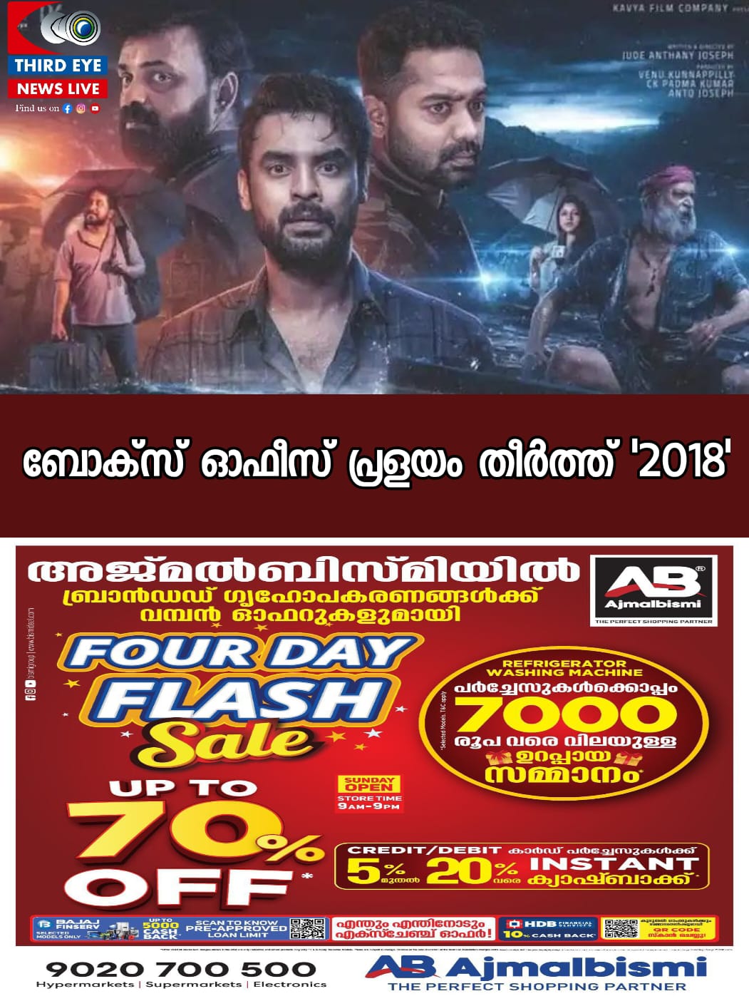 അതേസമയം, ഇന്ന് മുതല് തമിഴ്, തെലുങ്ക്, കന്നട, ഹിന്ദി ഭാഷകളില് ചിത്രം റിലീസിനെത്തും. മറ്റ് ഭാഷകളിലെ പ്രദര്ശനം കളക്ഷനില് കാര്യമായ വര്ധനവ് ഉണ്ടാക്കുമെന്നാണ് ട്രേഡ് അനലിസ്റ്റികളുടെ വിലയിരുത്തല്. നിറഞ്ഞ സദസ്സില് 2018 പ്രദര്ശനം തുടരുകയാണ്.ടൊവിനോ തോമസ്, കുഞ്ചാക്കോ ബോബന്, ആസിഫ് അലി, വിനീത് ശ്രീനിവാസന്, ഇന്ദ്രന്സ്, ലാല്, നരേന്, അപര്ണ്ണ ബാലമുരളി, തന്വി റാം, സുധീഷ്, സിദ്ദിഖ്, രഞ്ജി പണിക്കര്, ജാഫര് ഇടുക്കി, അജു വര്ഗ്ഗീസ്, ജിബിന് ഗോപിനാഥ്, ഡോ. റോണി, ശിവദ, വിനീത കോശി തുടങ്ങി വന് താരനിര ചിത്രത്തില് ഉണ്ടായിരുന്നു. കാവ്യ ഫിലിംസ്, പികെ പ്രൈം പ്രൊഡക്ഷന്സ് എന്നീ ബാനറുകളില് വേണു കുന്നപ്പിള്ളി, സി കെ പത്മകുമാര്, ആന്റോ ജോസഫ് എന്നിവര് ചേര്ന്നാണ് ചിത്രം നിര്മ്മിച്ചിരിക്കുന്നത്. അഖില് പി ധര്മജന് ആണ് തിരക്കഥ.