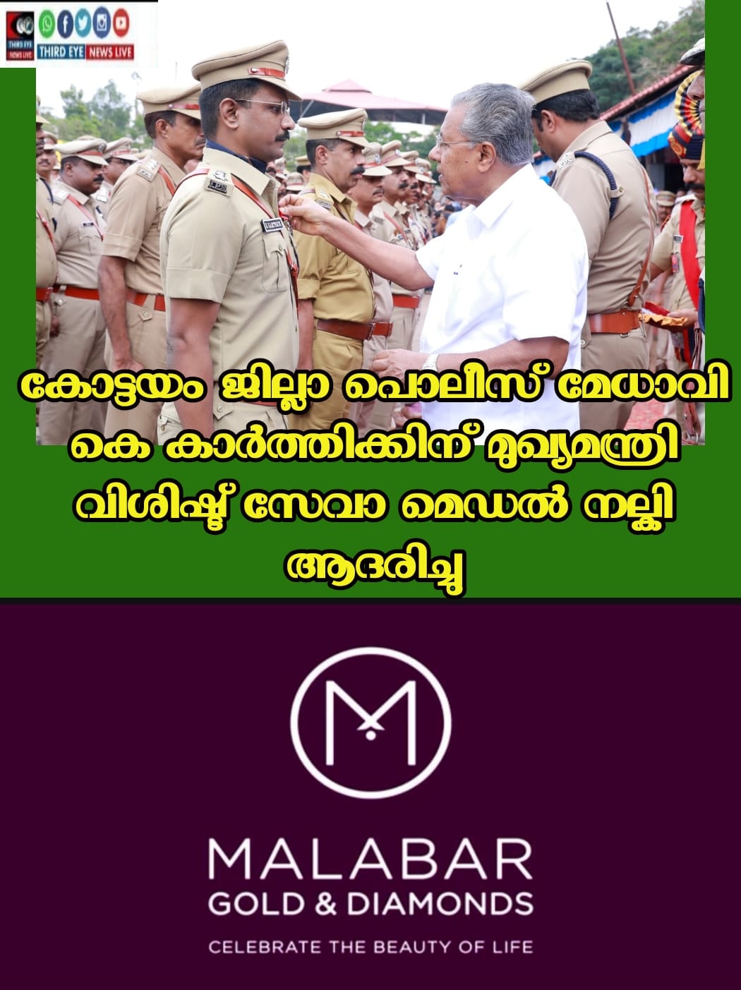 വിശിഷ്ട സേവനത്തിനുള്ള പോലീസ് മെഡല് കോട്ടയം ജില്ലാ പോലീസ് മേധാവി കെ.കാർത്തിക് ഉൾപ്പെടെ ആറ് പോലീസ് ഉദ്യോഗസ്ഥർ മുഖ്യമന്ത്രി പിണറായി വിജയനില് നിന്നും ഏറ്റുവാങ്ങി .