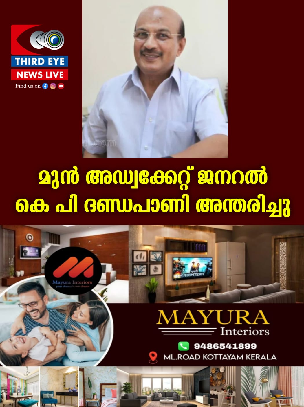 കൊച്ചി: മുൻ അഡ്വക്കറ്റ് ജനറലും മുതിർന്ന അഭിഭാഷകനുമായ കെ.പി.ദണ്ഡപാണി അന്തരിച്ചു. 79 വയസ്സായിരുന്നു. കൊച്ചിയിലെ വീട്ടില് വെച്ചായിരുന്നു അന്ത്യം.അസുഖബാധിതനായി ചികിത്സയിലായിരുന്നു.