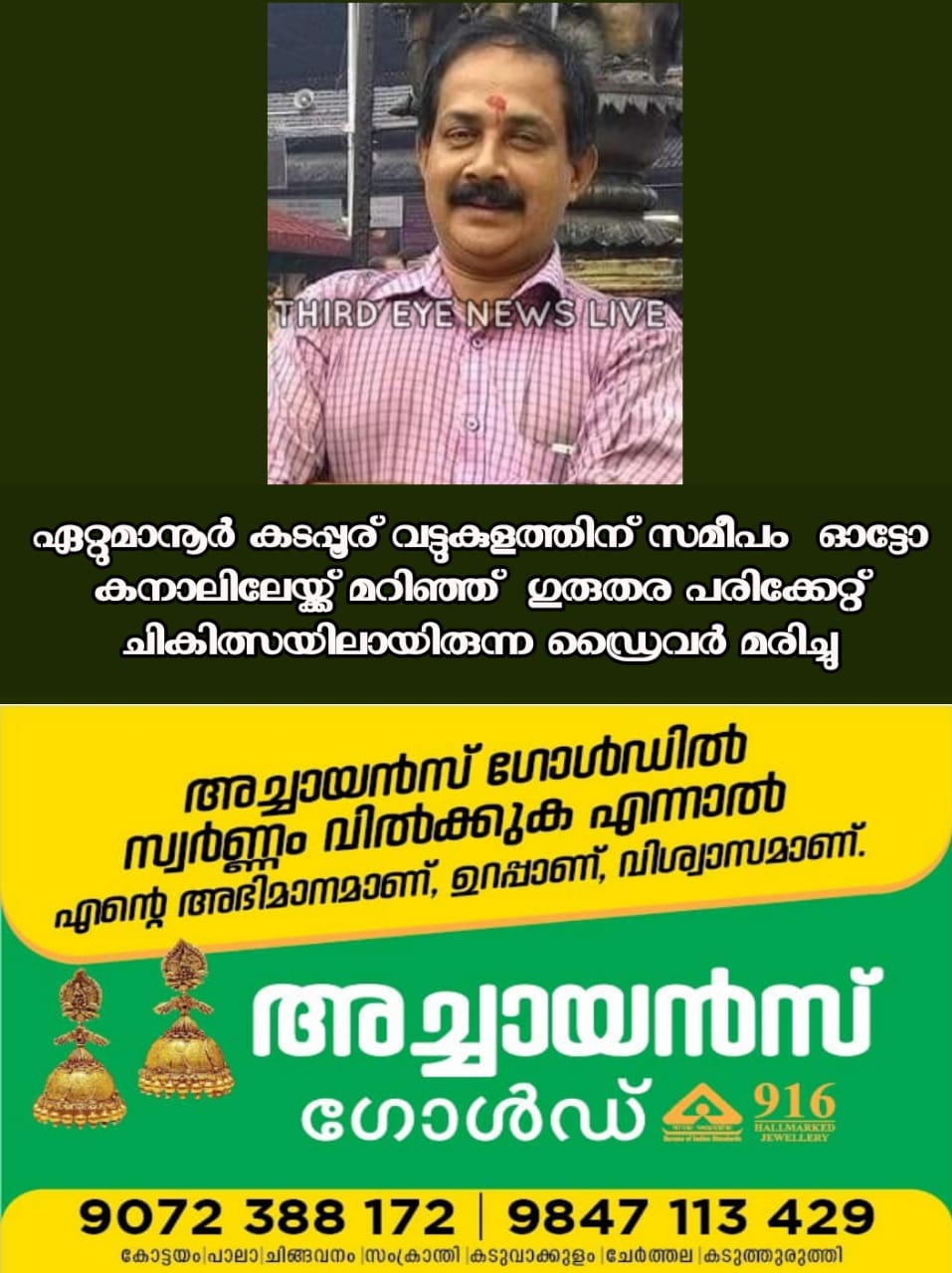 ഏറ്റുമാനൂർ കടപ്പൂര് വട്ടുകുളത്തിന് സമീപം ഓട്ടോ കനാലിലേയ്ക്ക് മറിഞ്ഞ് ഗുരുതര പരിക്കേറ്റ് ചികിത്സയിലായിരുന്ന ഡ്രൈവർ മരിച്ചു; കനാലിന്റെ സമീപം ഓട്ടോ തിരിക്കാൻ ശ്രമിക്കുമ്പോൾ വാഹനം താഴ്ചയുള്ള കനാലിൽ പതിക്കുകയായിരുന്നു; മെഡിക്കൽ കോളേജിൽ ചികിത്സയിലിരിക്കെയാണ് മരണം