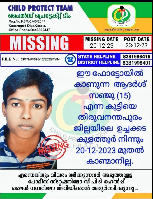 കുട്ടിയെക്കുറിച്ച് എന്തെങ്കിലും വിവരം ലഭിക്കുന്നവര് അടുത്ത പോലീസ് സ്റ്റേഷനിലോ പൊഴിയൂര് പോലിസിനെയോ അറിയിക്കണമെന്നാണ് നിര്ദേശം. പൊഴിയൂര് പോലീസ് സ്റ്റേഷന് നമ്പര് 04712212100 ,എസ്എച്ച് ഒ::9497947121.