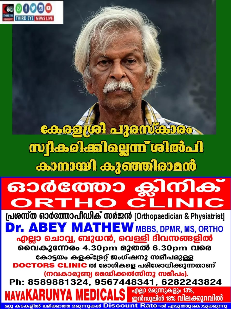 തിരുവനന്തപുരം: പ്രഥമ കേരളശ്രീ പുരസ്കാരം സ്വീകരിക്കില്ലെന്ന് ശില്പി കാനായി കുഞ്ഞിരാമൻ. ശിൽപ്പങ്ങൾ മതിയായ രീതിയില് സംരക്ഷിക്കാത്തതിൽ പ്രതിഷേധിച്ചാണ് തീരുമാനം. പുരസ്കാരം സ്വീകരിക്കില്ലെന്ന് സർക്കാറിനെ ഔദ്യോഗികമായി അറിയിക്കുമെന്നും കാനായി കുഞ്ഞിരാമൻ പറഞ്ഞു.