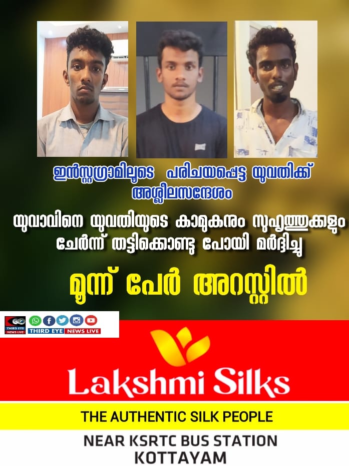 കാഞ്ഞിരപ്പള്ളി: ഇൻസ്റ്റഗ്രാമിലൂടെ പരിചയപ്പെട്ട യുവതിക്ക് അശ്ലീലസന്ദേശമയച്ച യുവാവിന് യുവതിയുടെ കാമുകന്റേയും സുഹൃത്തുക്കളുടേയും മർദ്ദനം. യുവതിയുടെ കാമുകനും സുഹൃത്തുക്കളും ചേര്ന്ന് തട്ടിക്കൊണ്ടു പോയി മര്ദ്ദിച്ചതായാണ് പരാതി. സംഭവത്തിൽ കാമുകനും സുഹൃത്തുക്കളും അറസ്റ്റിൽ.
