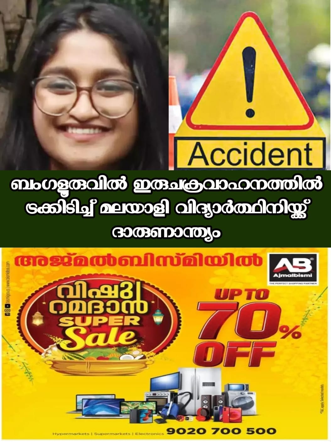 ബം​ഗളൂരുവിൽ ഇരുചക്രവാഹനത്തിൽ ട്രക്കിടിച്ച് മലയാളി വിദ്യാർത്ഥിനിയ്ക്ക് ദാരുണാന്ത്യം; മരിച്ചത് കണ്ണൂർ സ്വദേശിനിയായ പത്തൊൻപതുകാരി