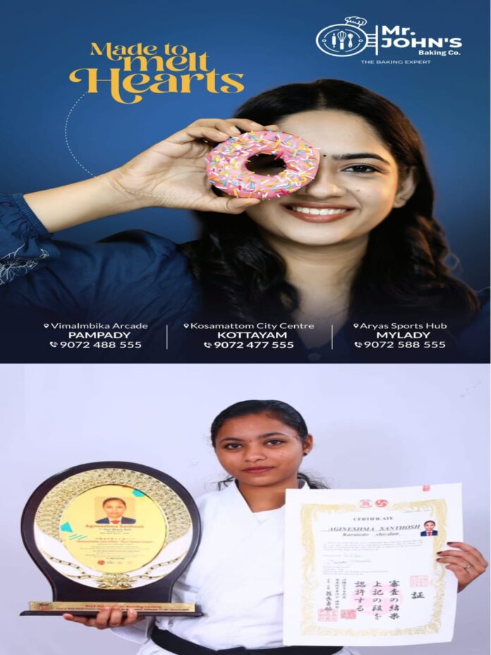 കുമരകത്തിന് അഭിമാനമായി: കരാട്ടെയിൽ ബ്ലാക്ക് ബെൽറ്റ് നേടി അഗിനേഷ്മ സന്തോഷ് :ശ്രീകുമാരമംഗലം ഹയർ സെക്കൻഡറി സ്കൂളിലെ പ്ലസ് ടു വിദ്യാർത്ഥിനിയാണ്.