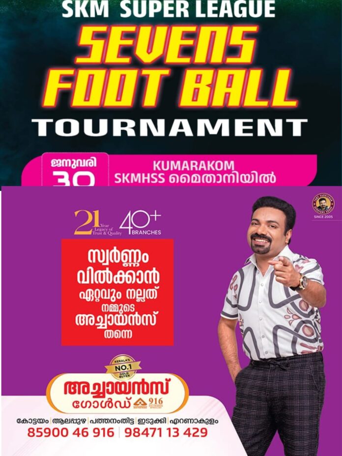 കുമരകം: ‘മാരക ലഹരി വേണ്ട, കായിക ലഹരി മതി’ എന്ന സന്ദേശവുമായി കോട്ടയം ജില്ലാ പഞ്ചായത്തും കുമരകം എസ്.കെ.എം.എച്ച്.എസ്.എസും സംയുക്തമായി സംഘടിപ്പിക്കുന്ന എസ്.കെ.എം സൂപ്പർ ലീഗ് സെവൻസ് ഫുട്ബോൾ ടൂർണ്ണമെന്റിന് ഇന്നു തുടക്കം കുറിക്കും.