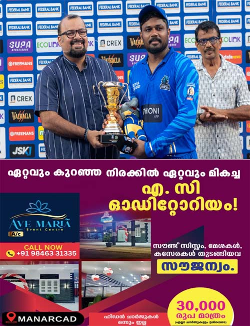 പിന്നീട് ഫീല്ഡിംഗിനെത്തിയപ്പോള് ഒരു ക്യാച്ചും സഞ്ജു സ്വന്തമാക്കിയിരുന്നു. ആദ്യ കെസിഎല് കളിക്കുന്ന സഞ്ജു രണ്ടാം തവണയാണ് പ്ലെയര് ഓഫ് ദ മാച്ച് പുരസ്കാരം നേടുന്നത്. കൊല്ലം, സെയ്ലേഴ്സിനെതിരായ മത്സരത്തിലും സഞ്ജുവിനായിരുന്നു പുരസ്കാരം. അന്ന് സെഞ്ചുറി നേടിയിരുന്നു സഞ്ജു.