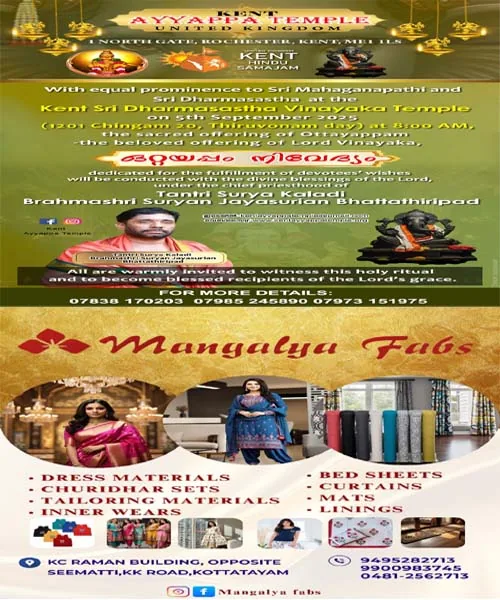 ഇംഗ്ലണ്ടിലെ കെൻ്റ് ശ്രീധർമ്മശാസ്താ – ക്ഷേത്ര സന്നിധിയിൽ ശ്രീ മഹാഗണപതിയും, ശ്രീ ധർമശാസ്താവും തുല്യ പ്രാധാന്യത്തോടെ വാണരുളുന്ന ശ്രീ ധർമ്മശാസ്താ – വിനായക ക്ഷേത്രത്തിൽ 2025 സെപ്റ്റംബർ 5 തിരുവോണ ദിവസത്തിൽ രാവിലെ 8 മണിക്ക് വിഘ്നേശ്വര സ്വാമിയുടെ ഇഷ്ടവഴിപാടും ‘ ഉദ്ധിഷ്ടകാര്യ സിദ്ധിക്കായി സമർപ്പിക്കുന്ന ”ഒറ്റയപ്പം ” നിവേദ്യം ക്ഷേത്രം തന്ത്രി സൂര്യകാലടിമന ബ്രഹ്മശ്രീ സൂര്യൻ ജയസൂര്യൻ ഭട്ടതിരിപ്പാടിന്റെ മുഖ്യകാർമികത്വത്തിൽ നടത്തപ്പെടുന്നു.