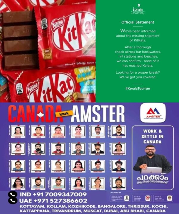 കേരള ടൂറിസം സോഷ്യല്‍ മീഡിയ പേജിലാണ് രസകരമായ പരസ്യം വന്നത്. ഔദ്യോഗിക പ്രസ്‌താവന എന്ന പേരില്‍ നല്‍കിയിരിക്കുന്ന പോസ്റ്റില്‍ കിറ്റ്‌കാറ്റ് ഷിപ്‌മെന്റ് കാണാതായതായി അറിഞ്ഞെന്നും കേരളത്തിലെവിടെയും അത് കണ്ടെത്തിയില്ലെന്നും അതുകൊണ്ട് കേരളത്തിലത് എത്തിയിട്ടില്ലെന്നും തമാശരൂപത്തില്‍ പറയുന്നുണ്ട്.
