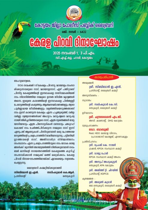 കോട്ടയം : ജില്ലാ പോലീസ് പബ്ലിക്ക് ലൈബ്രറിയുടെ ആഭിമുഖ്യത്തിൽ കേരള പിറവി ദിനാഘോഷം സംഘടിപ്പിച്ചു.