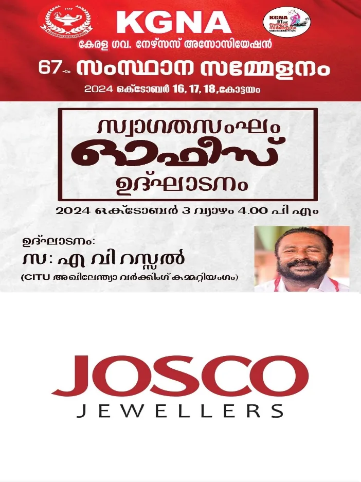 കെജിഎൻഎ സംസ്ഥാന സമ്മേളനത്തിൻ്റെ ഭാഗമായി കോട്ടയത്തെ സ്വാഗതസംഘം ഓഫീസ് എ വി റസൽ ഉദ്ഘാടനം ചെയ്യും