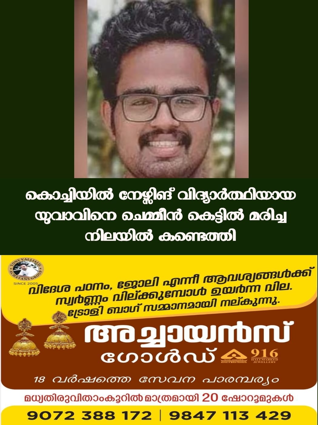 കൊച്ചി; നേഴ്സിങ്ങ് വിദ്യാർത്ഥിയായ യുവാവിനെ ചെമ്മീൻ കെട്ടിൽ മരിച്ച നിലയിൽ കണ്ടെത്തി. കെടാമംഗലം പപ്പുക്കുട്ടി മെമ്മോറിയൽ ലൈബ്രറി പ്രസിഡന്റും ഹെൽപ് ഫോർ ഹെൽപ് ലസ് സംഘടനയുടെ ഭാരവാഹിയുമായ വടക്കേ നികത്തിൽ പിപി സുകുമാരന്റെ മകൻ അമലേന്ദു (24) ആണ് മരിച്ചത്.
