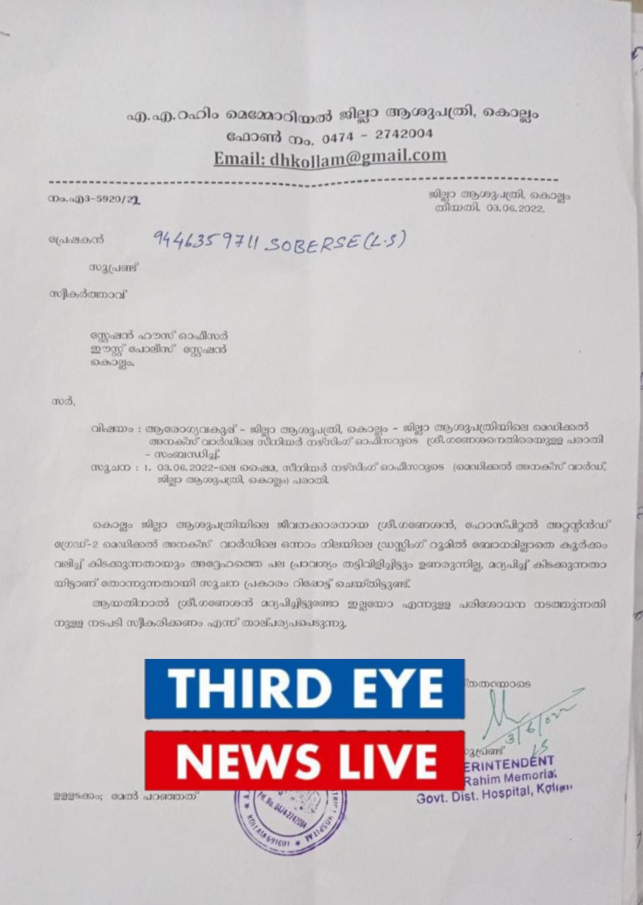കൊല്ലം ജില്ലാ ആശുപത്രിയിലാണ് സംഭവം. ജീവനക്കാരനായ ഗണേശൻ ഡ്രസിംങ് റൂമിൽ ബോധമില്ലാതെ കിടക്കുന്നുവെന്നും, കൂർക്കം വലിച്ച് ഉറങ്ങുന്ന അദ്ദേഹത്തെ പലപ്രാവശ്യം തട്ടി വിളിച്ചിട്ടും ഉണരുന്നില്ലന്നും മദ്യപിച്ചിട്ടുണ്ടോയെന്ന് സംശയിക്കുന്നതായും സുപ്രണ്ട് നല്കിയ കത്തിൽ പറയുന്നു.