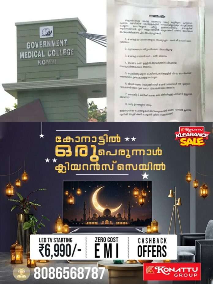 കോന്നി മെഡിക്കല് കോളേജിലെ അപര്യാപ്തതകള് ചൂണ്ടിക്കാട്ടി സർജറി വിഭാഗത്തില് നോട്ടീസ് പതിച്ചിരുന്നു. എന്നാല്, അത് പരസ്യമായി ഒട്ടിച്ചത് താൻ അല്ലെന്നും സംഭവത്തില് തികച്ചും നിരപരാധിയാണെന്നുമാണ് കഴിഞ്ഞ ദിവസം ഡോക്ടർ കാരണം കാണിക്കല് നോട്ടീസില് നല്കിയ വിശദീകരണം.