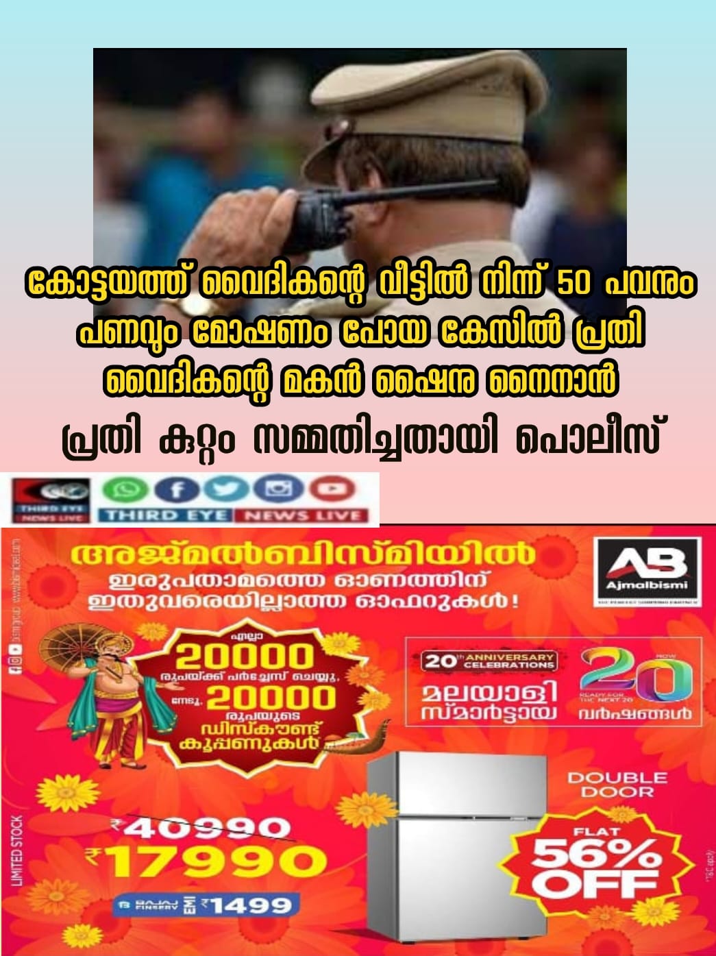 കോട്ടയം : കോട്ടയത്ത് വൈദികന്റെ വീട്ടിൽ നിന്ന് 50 പവനും പണവും മോഷണം പോയ കേസിൽപ്രതി വൈദികന്റെ മകൻ ഷൈനു നൈനാൻ , പ്രതി കുറ്റം സമ്മതിച്ചതായി പെലീസ്