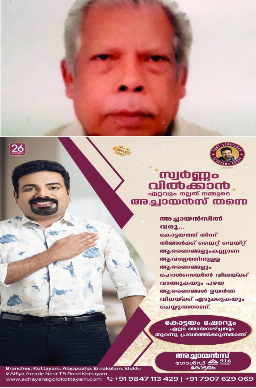 കാലിലും കൈയിലും പുറത്തുമെല്ലാം പൊള്ളലേറ്റ നിലയിലായിരുന്നു. ഉടന് തന്നെ കോട്ടയത്തെ സ്വകാര്യ ആശുപത്രി പ്രവേശിപ്പിച്ചെങ്കിലും ജീവന് രക്ഷിക്കാനായില്ല. ഭാര്യ: പ്രസന്നകുമാരി. സംസ്കാരം ഇന്നു വൈകിട്ട് 3നു വീട്ടുവളപ്പില്.