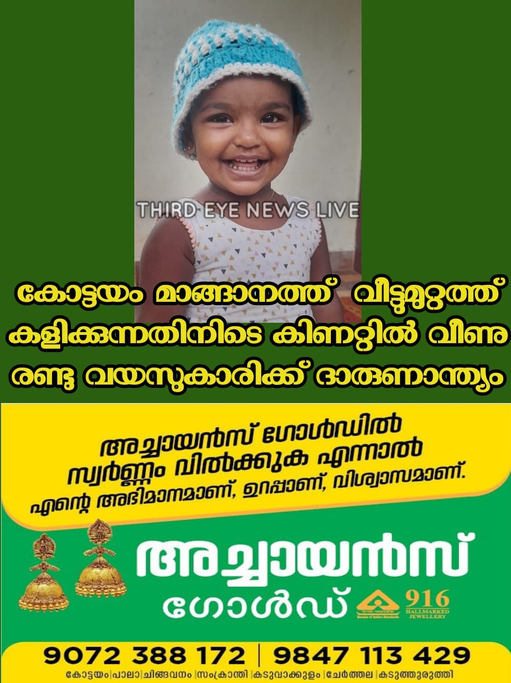 കോട്ടയം: വീട്ടുമുറ്റത്ത് കളിക്കുന്നതിനിടെ കൽ വഴുതി കിണറ്റിൽ വീണ് രണ്ടു വയസുകാരിക്ക് ദാരുണാന്ത്യം. മാങ്ങാനം ലക്ഷംവീട് കോളനിയിൽ ഒളവാപ്പറമ്പിൽ ശാലു സുരഷ് നിബിൻ ബിജു ദമ്പതികളുടെ മകൾ നൈസാ മോൾ (രണ്ട് വയസ്) ആണ് മരിച്ചത്.