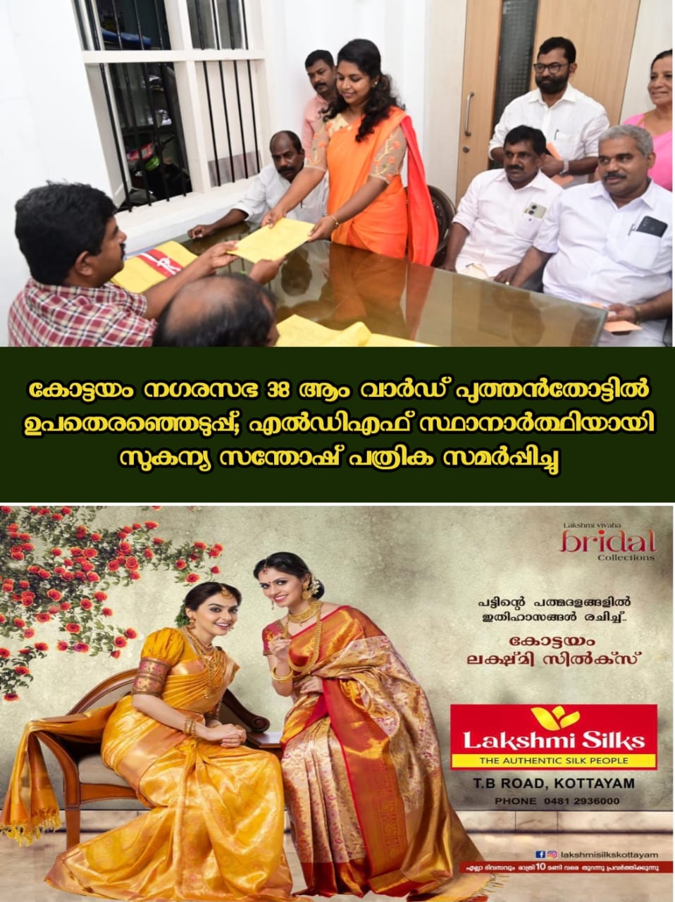 കോട്ടയം: നഗരസഭ 38 ആം വാർഡ് പുത്തൻതോട്ടിൽ ഉപതെരഞ്ഞെടുപ്പിൽ എൽഡിഎഫ് സ്ഥാനാർത്ഥിയായി സുകന്യ സന്തോഷ് പത്രിക സമർപ്പിച്ചു.