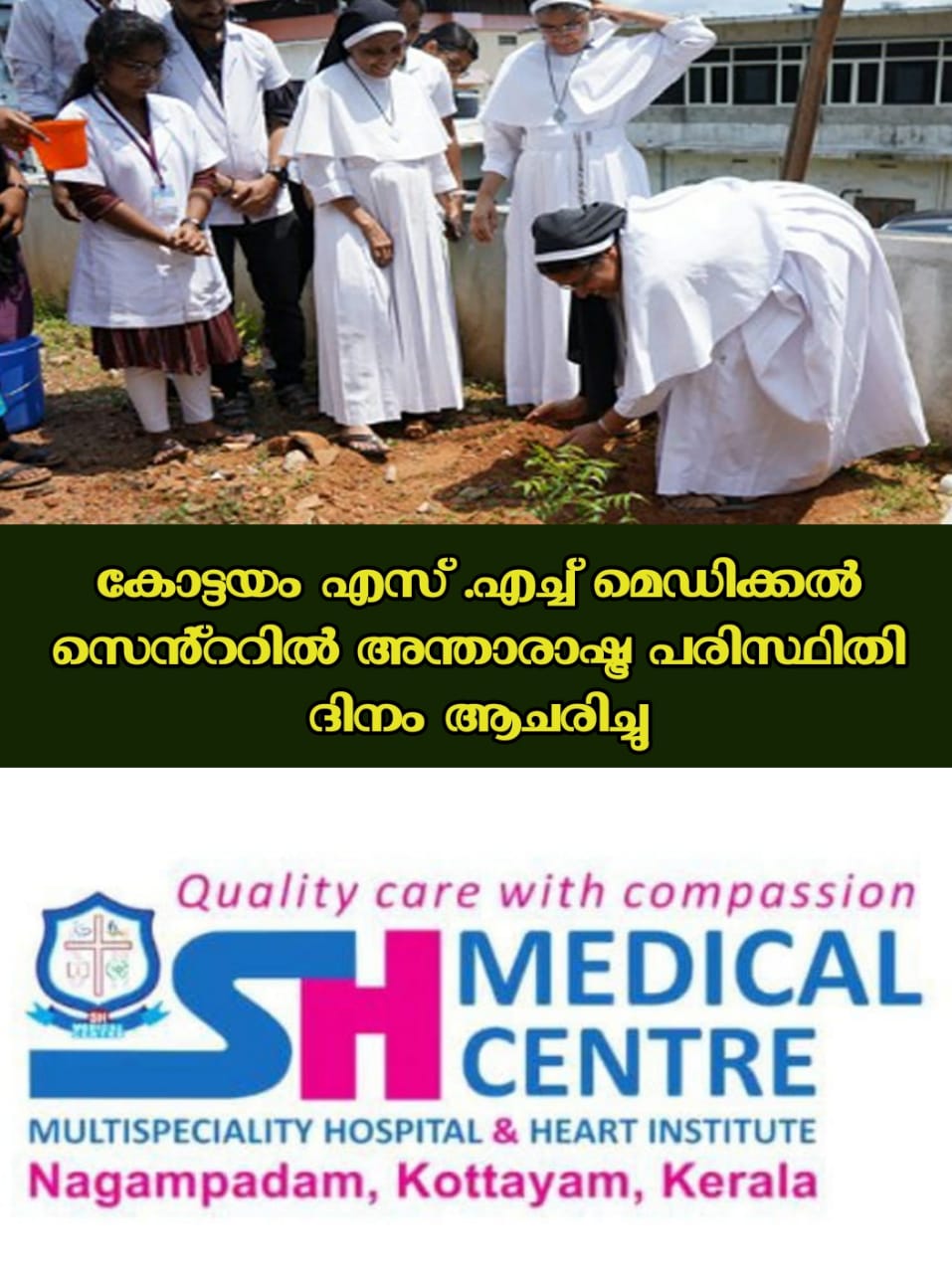 കോട്ടയം: എസ് എച്ച് മെഡിക്കൽ സെൻ്ററിൽ അന്താരാഷ്ട്ര പരിസ്ഥിതി ദിനം ആചരിച്ചു. ആശുപത്രി വളപ്പിൽ ഔഷധചെടികളിൽ ഒഴിച്ച് കൂടാനാവാത്ത ആര്യവേപ്പിൻ തൈ നട്ടുകൊണ്ട് ഹോസ്പിറ്റൽ ഡയറക്റ്റർ സി. കാതറൈൻ നെടുമ്പുറം ചടങ്ങ് ഉദ്ഘാടന കർമ്മം നിർവ്വഹിച്ചു. ,തുടർന്ന് പരിസ്ഥിതി സംരക്ഷണത്തെ കുറിച്ചുള്ള കൂടുതൽ അറിവുകൾ പകർന്നു.