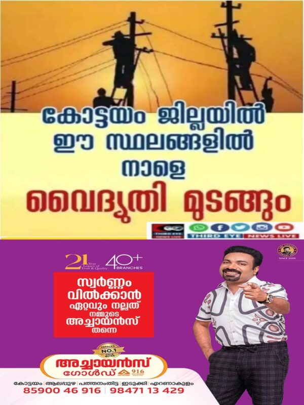 KSEB തെങ്ങണ ഇലക്ട്രിക്കൽ സെക്ഷന് കീഴിലുള്ള, കൈതമറ്റം ഉണ്ട കുരിശ് ,പൊന്നാഞ്ചിറ കുറുമ്പനാടം, ഓവേലിപ്പടി, വഴിപ്പടി തൃക്കോയിക്കൽ ഇരുമ്പുഴി കുട്ടൻചിറ വെങ്കോട്ട, എന്നീ ട്രാൻസ്ഫോമർ പരിധിയിൽ, രാവിലെ 9 മണി മുതൽ വൈകിട്ട് 5.30 മണി വരെ വൈദ്യുതി മുടങ്ങും