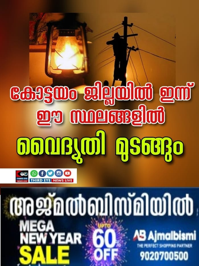 അയ്മനം സെക്ഷന്റെ പരിധിയിൽ ഉള്ള കരുമാൻകാവ് , ഒളശ്ശ SNDP, വൈദ്യശാല, എന്നീ ട്രാൻ ഫോർമറുകളുടെ കീഴിലുള്ള പ്രദേശങ്ങളിൽ രാവിലെ 9 മുതൽ വൈകിട്ട് 5:30 വരെ വൈദ്യുതി മുടങ്ങും.