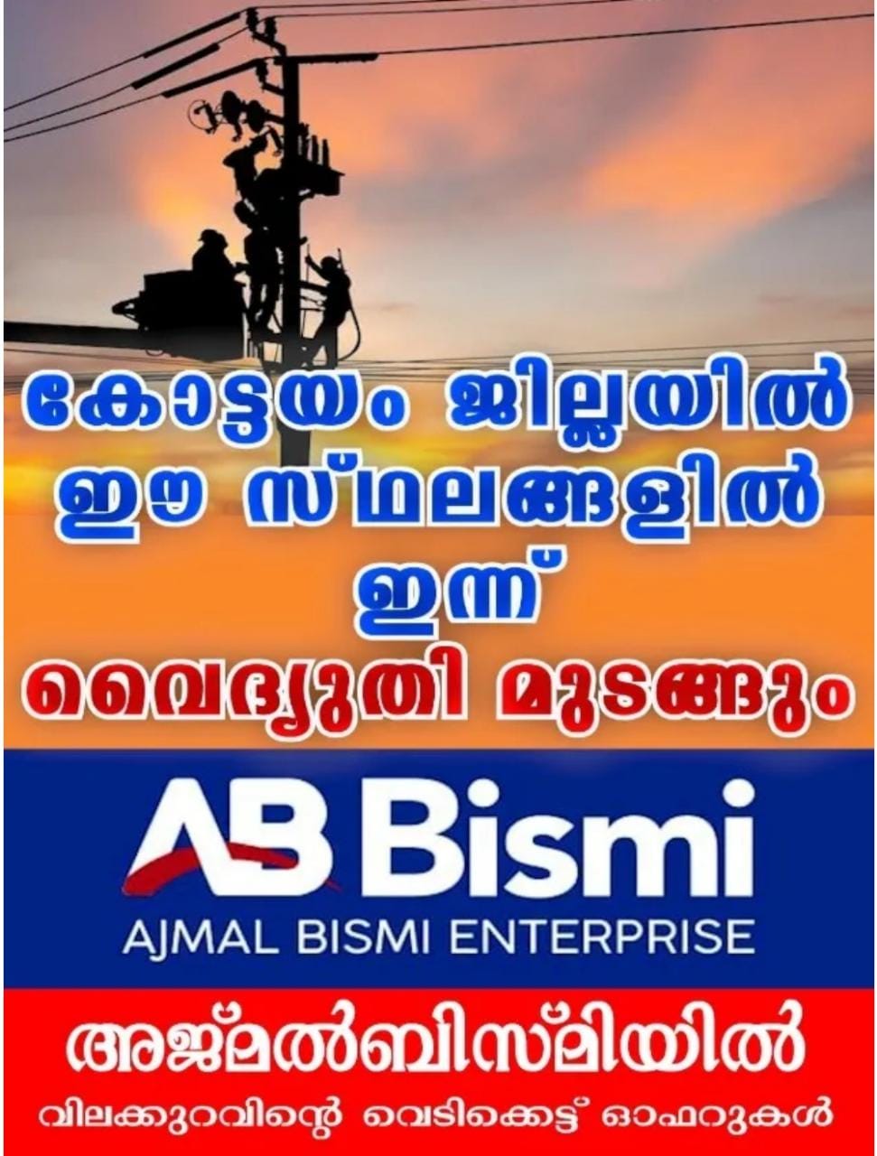 10) പാമ്പാടി ഇലക്ട്രിക്കൽ സെക്ഷൻ പരിധിയിൽ മഞ്ഞാടി അമ്പലം, പറുതലമറ്റം, കക്കാട്ടുപടി എന്നിവിടങ്ങളിൽ രാവിലെ 9 മണി മുതൽ 5 മണി വരെ ഭാഗികമായി വൈദ്യുതി മുടങ്ങും