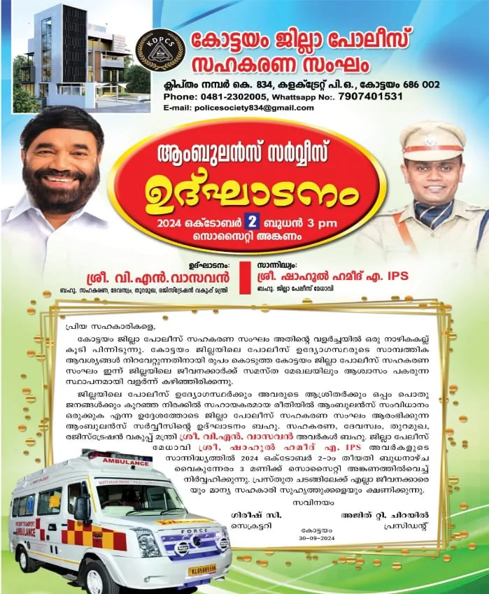 പോലീസ് ഉദ്യോഗസ്ഥർക്കും അവരുടെ ആശ്രിതർക്കും കൂടാതെ പൊതുജനങ്ങൾക്കും സഹായകരമായ തരത്തിൽ കുറഞ്ഞ നിരക്കിൽ ആംബുലൻസ് സർവീസ് സംവിധാനം ഒരുക്കുക എന്ന ലക്ഷ്യവുമായി ജില്ലാ പോലീസ് സഹകരണ സംഘം ആംബുലൻസ് സർവീസ് ആരംഭിക്കുന്നു.