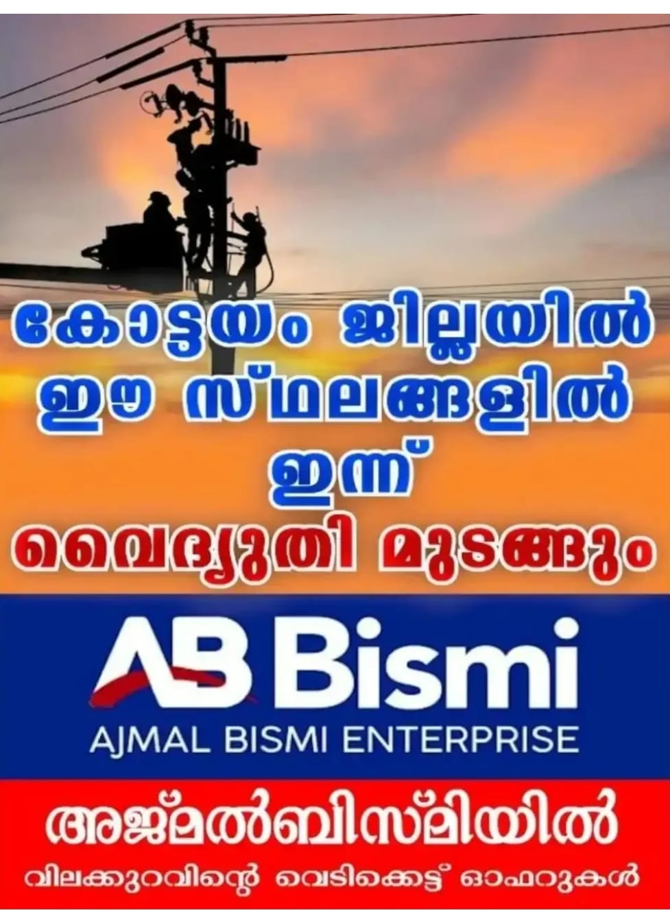 1. മണർകാട് സെക്ഷൻ്റെ പരിധിയിൽ വരുന്ന മംഗലം, വല്യൂഴം, ഓൾഡ് കെ കെ റോഡ് ,മണർകാട് ടൌൺ , ഗുഡ് ന്യൂസ്, പുളിമൂട് ,പൂപ്പട ,ഫാൻസി, ബേയ്സ്, തെങ്ങും തുരുത്തേൽ എന്നീ ട്രാൻസ്ഫോർമറുകളിൽ രാവിലെ 09:00 മുതൻ വൈകുന്നേരം 05:00 വരെ വൈദ്യുതി മുടങ്ങും
