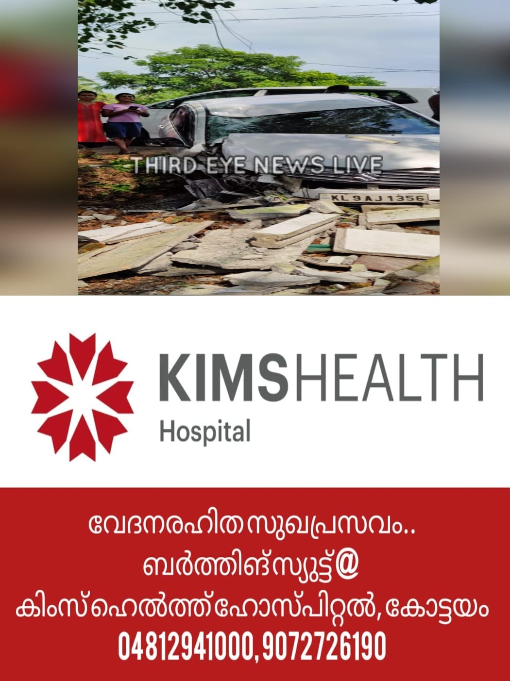 കാറിന്റെ മുൻ വശം പൂർണ്ണമായും തകർന്നിട്ടുണ്ട് . KL9AJ1356 എന്ന നമ്പറിലുള്ള കാറാണ് അപകടത്തിൽ പെട്ടത്.