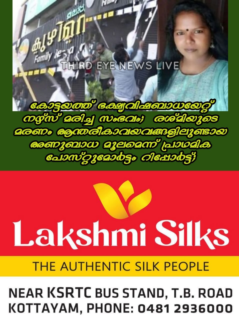 കോട്ടയത്ത് ഭക്ഷ്യവിഷബാധയേറ്റ് നഴ്സ് മരിച്ച സംഭവം; രശ്മിയുടെ മരണം ആന്തരീകാവയവങ്ങളിലുണ്ടായ അണുബാധ മൂലമെന്ന് പ്രാഥമിക പോസ്റ്റുമോർട്ടം റിപ്പോർട്ട്; ശരീര ശ്രവങ്ങൾ രാസ പരിശോധനയ്ക്ക് അയയ്ക്കും