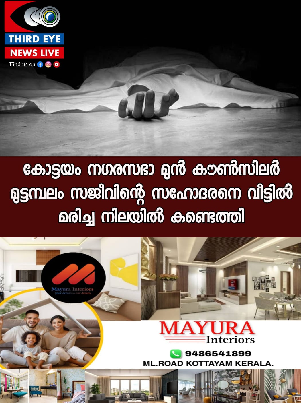 കോട്ടയം: കോട്ടയം നഗരസഭ മുൻ കൗൺസിലർ മുട്ടമ്പലം സജീവിന്റെ സഹോദരനെ വീട്ടിൽ മരിച്ച നിലയിൽ കണ്ടെത്തി. മുട്ടമ്പലം കൊപ്രത്ത് ക്ഷേത്രത്തിന് സമീപം കാഞ്ഞിരക്കാട്ട് വീട്ടിൽ രാജീവിനെയാണ്(62) മരിച്ച നിലയിൽ കണ്ടെത്തിയത്.