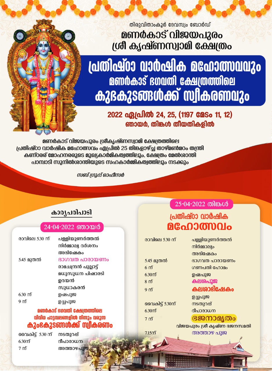 25 തിങ്കളാഴ്ച പ്രതിഷ്ഠാ വാർഷിക മഹോത്സവം രാവിലെ ‘5.30 ന് പള്ളിയുണർത്തൽ ‘നിർമ്മാല്യംഅഭിഷേകം, 5.45 മുതൽ ഭാഗവത പാരായണം