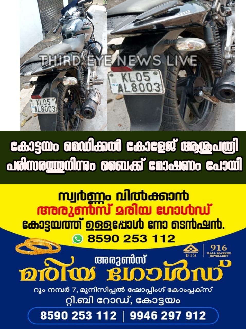 കോട്ടയം: മെഡിക്കൽ കോളോജ് ആശുപത്രി ക്വാഷ്യാലിറ്റിയുടെ സമീപത്തുനിന്നും ബൈക്ക് മോഷണം പോയതായി പരാതി. തിരുവാർപ്പ് സ്വദേശിയാ നിഖിലിന്റെ സുഹൃത്തിന്റെ KL 05 AL 8003 എന്ന നമ്പറിലുള്ള ബ്ലാക്ക് നിറത്തിലുള്ള പൾസർ ബൈക്കാണ് മോഷണം പോയത്.
