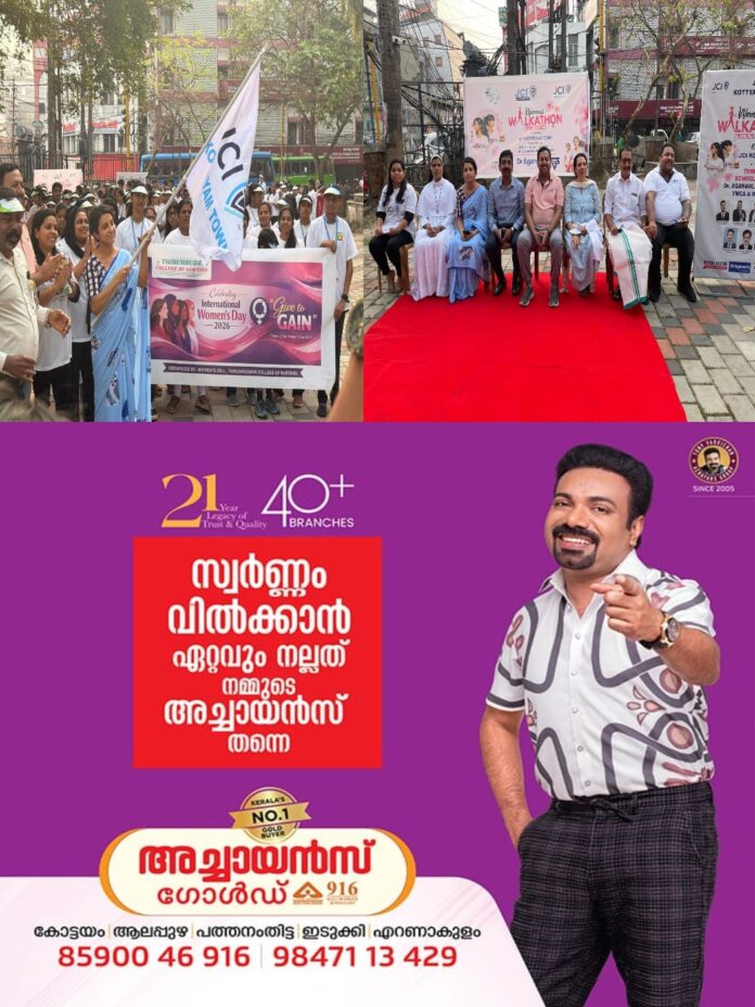 കോട്ടയം: ജെസിഐ കോട്ടയം ടൗൺ ചാപ്റ്ററിന്റെ ആഭിമുഖ്യത്തിൽ വനിതാ ദിനത്തോടനുബന്ധിച്ച് സ്ത്രീ ശാക്തീകരണവും സ്തീസമത്വവും സ്ത്രീ സുരക്ഷയും മുൻനിർത്തി വനിതാ വാക്കത്തോൺ സംഘടിപ്പിച്ചു.