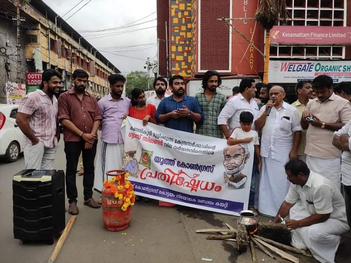 സാധാരണക്കാരുടെ കഞ്ഞികുടി മുട്ടിക്കുന്ന മോദി സർക്കാരിൻറെ അനിയന്ത്രിതമായ പാചകവാതക വിലവർധനവിനെതിരെ യൂത്ത് കോൺഗ്രസ്സ് കോട്ടയം നിയോജക മണ്ഡലം കമ്മിറ്റിയുടെ നേതൃത്വത്തിൽ ഗ്യാസ് സിലണ്ടറിൽ മാല ഇട്ട് പ്രതിക്ഷേധം നടത്തി