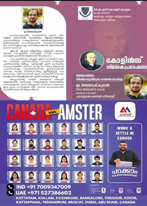 കോട്ടയം: കോട്ടയം സിഎംഎസ് കോളേജ് മലയാള വിഭാഗത്തിന്റെ ആഭ്യമുഖ്യത്തിൽ കോളിൻസ് സ്മാരക പ്രഭാഷണപരമ്പരയിലെ ഈ വർഷത്തെ പ്രഭാഷണം നാളെ (13/01/2026) രാവിലെ 9.30 മണിയ്ക്ക് എഡ്യൂക്കേഷണൽ തീയേറ്ററിൽ നടക്കും. 2025 ലെ വയലാർ പുരസ്കാര ജേതാവും ചെറുകഥാകൃത്തും നോവലിസ്റ്റുമായ ഇ. സന്തോഷ്കുമാർ പ്രഭാഷണം നിർവഹിക്കും.