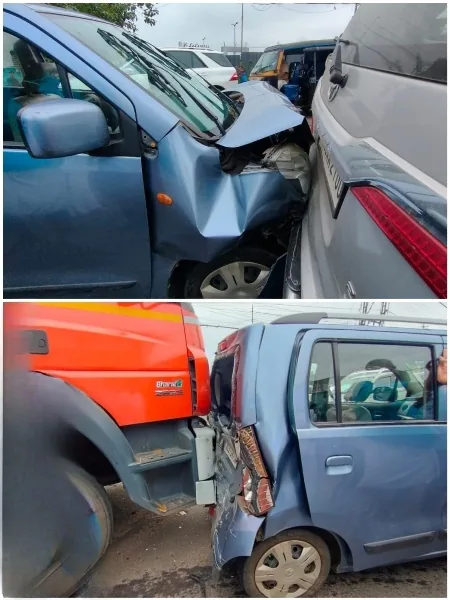 ഈ കാർ നിരങ്ങി മറ്റ് രണ്ട് കാറുകൾക്ക് പിന്നിലും ഇടിച്ചു കയറുകയായിരുന്നു.