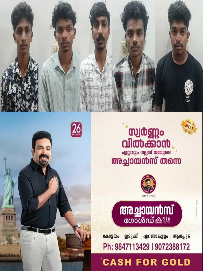 മൂന്നിലവ് കീരിപ്ലാക്കല് സാമുവല് (20), വയനാട് നടവയല് ഞാവല്ത്ത് ജീവ (19), മലപ്പുറം സ്വദേശികളായ മഞ്ചേരി കച്ചേരിപ്പടി വീട്ടില് റിജില്ജിത്ത് (20), വണ്ടൂർ കരുമാരപ്പറ്റ രാഹുല്രാജ് (22), കോരുത്തോട് മടുക്ക സ്വദേശി നെടുങ്ങാട് വിവേക് (21)
