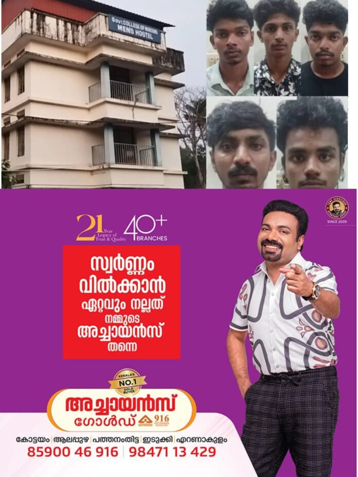 2024 നവംബര് മുതല് വിവിധ ഹോസ്റ്റല് മുറികളില് ആരംഭിച്ച മര്ദനമുറകള് സഹിക്കാനാവാതെ കഴിഞ്ഞ വര്ഷം ഫെബ്രുവരി 11നാണ് ഇരകളിലൊരാള് കോളജ് അധികാരികള്ക്ക് പരാതി നല്കിയതും ഗാന്ധിനഗര് പോലീസ് പ്രതികളെ അറസ്റ്റ് ചെയ്തതും. എസ്‌എഫ്ഐ, സിപിഎം അംഗങ്ങളും ഭാരവാഹികളും പാര്ട്ടി ഗുണ്ടകളുമാണ് അഞ്ചു പ്രതികളും.