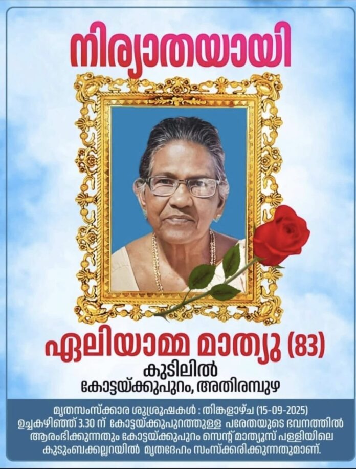 അതിരമ്പുഴ കോട്ടയ്ക്ക്പുറം കുടിലിൽ ഏലിയമ്മ മാത്യു(83) നിര്യാതയായി September 12, 2025 WhatsAppFacebookTwitterLinkedin Spread the loveകോട്ടയം : അതിരമ്പുഴ കോട്ടയ്ക്ക്പുറം കുടിലിൽ ഏലിയമ്മ മാത്യു(83) നിര്യാതയായി. സംസ്കാരം തിങ്കളാഴ്ച (15/09/25) ഉച്ചകഴിഞ്ഞ് 3 30ന് സന്റ് മാത്യൂസ് പള്ളിയിലെ കുടുംബ കല്ലറയിൽ.