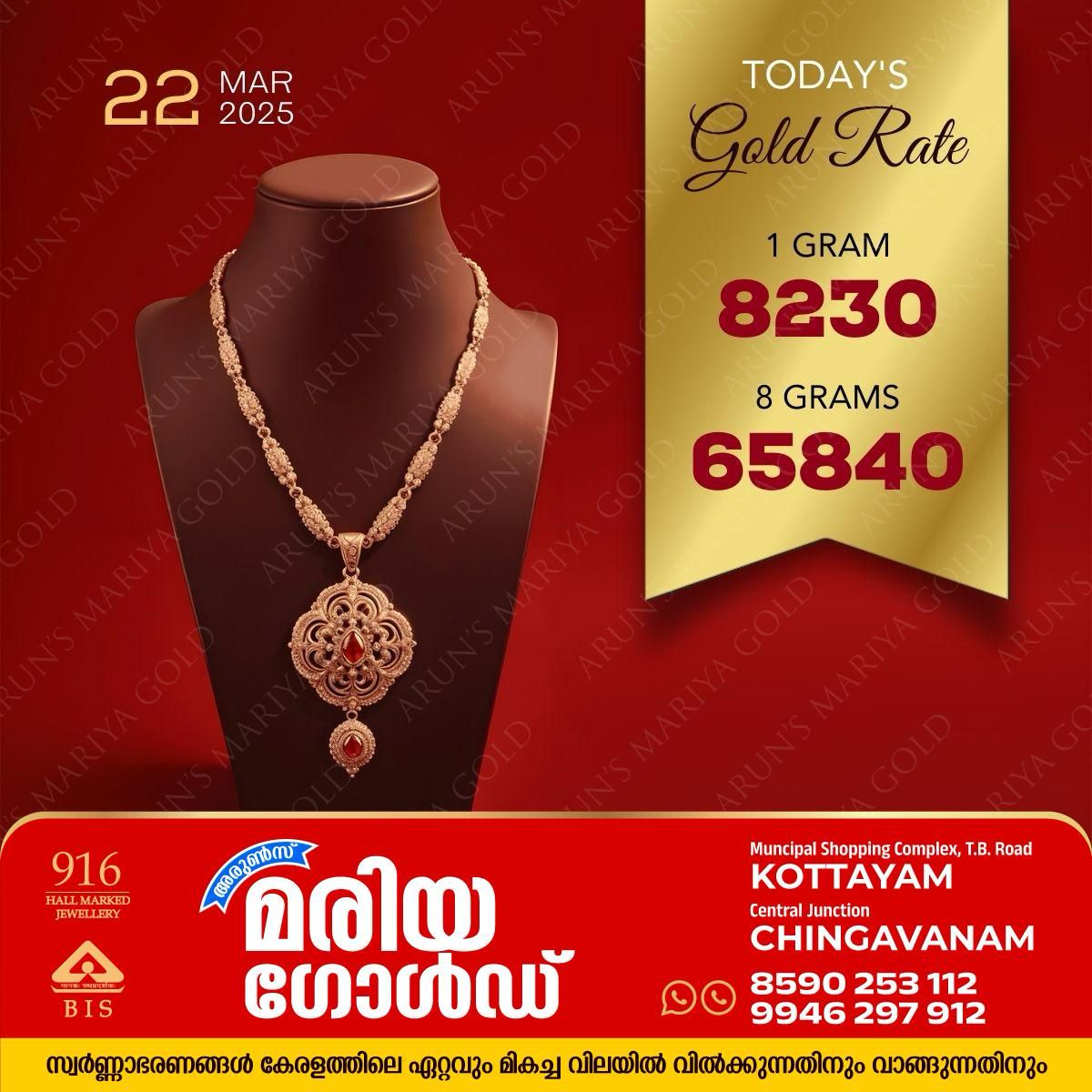 സംസ്ഥാനത്ത് ഇന്ന് (22/03/2025) സ്വർണ്ണവിലയിൽ ഇടിവ് ഗ്രാമിന് 40 രൂപ കുറഞ്ഞ് 8230 രൂപയിലെത്തി; കോട്ടയം അരുൺസ് മരിയ ഗോൾഡിലെ ഇന്നത്തെ സ്വർണവില അറിയാം
