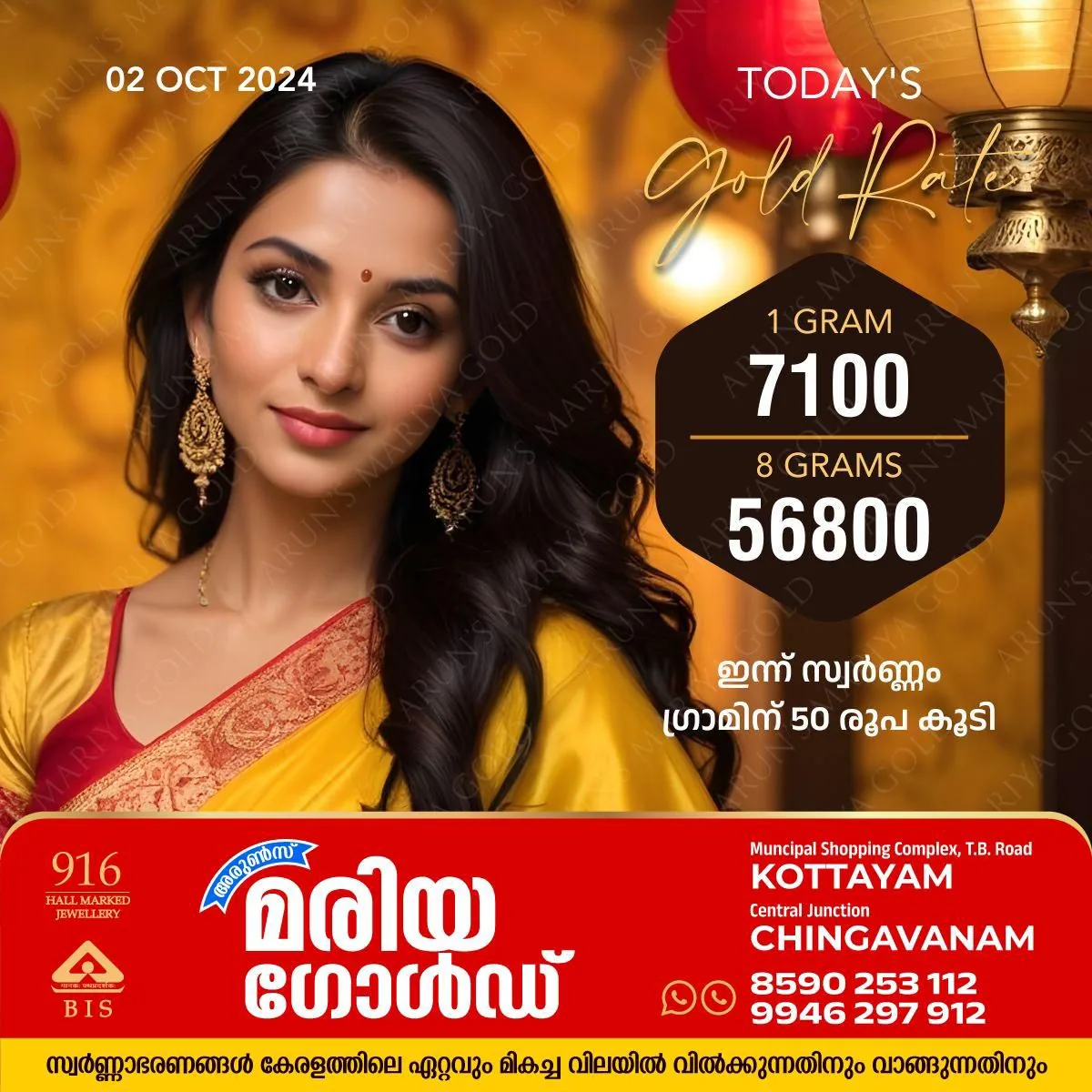 സംസ്ഥാനത്ത് ഇന്ന് (02/10/2024) സ്വർണവില വർധിച്ചു. ഗ്രാമിന് 20 രൂപ കൂടി.കോട്ടയം അരുൺസ് മരിയ ഗോൾഡിന്റെ ഇന്നത്തെ സ്വർണവില അറിയാം