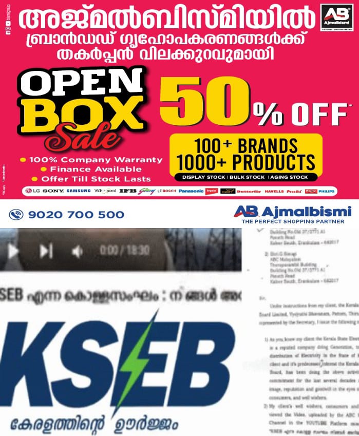 തിരുവനന്തപുരം: സമൂഹമാധ്യമങ്ങൾ വഴി വ്യാജപ്രചാരണം നടത്തിയെന്നാരോപിച്ച് എബിസി മലയാളം ന്യൂസ് എന്ന യുട്യൂബ് ചാനലിനെതിരെ കെഎസ്ഇബി നിയമനടപടികൾ ആരംഭിച്ചിരുന്നു. വ്യാജവാർത്ത പ്രചരിപ്പിച്ച അതേ മാധ്യമങ്ങളിലൂടെ മാപ്പുപറയുകയും യഥാർത്ഥ വസ്തുതകൾ അറിയിക്കുകയും ചെയ്യാത്ത പക്ഷം ഒരു കോടി രൂപ നഷ്ടപരിഹാരം നൽകണം എന്ന് കാണിച്ച് ചാനലിന് നോട്ടീസ് അയച്ചു.